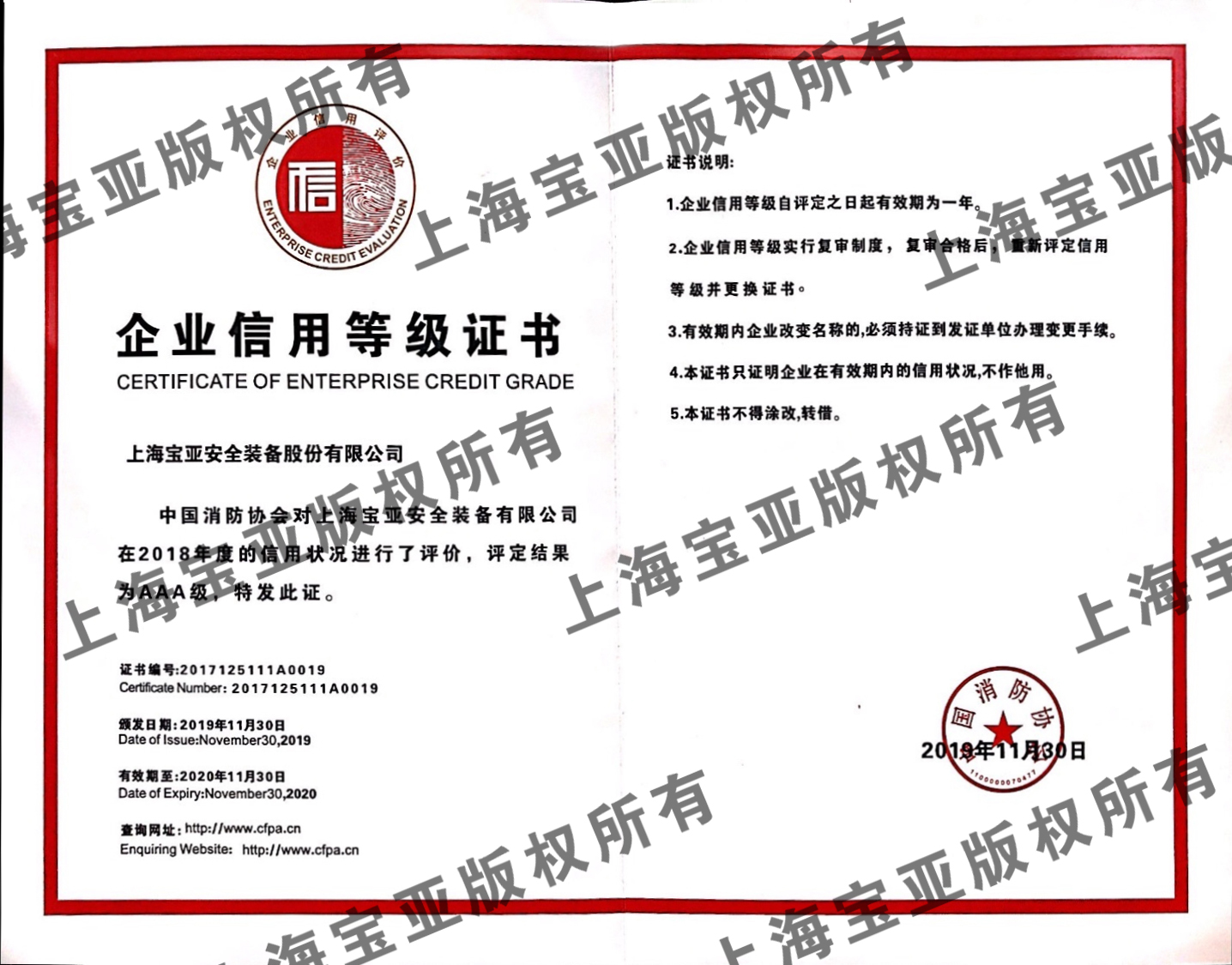 日前,上海寶亞順利通過中國消防協(xié)會的企業(yè)信用復審,維持原有級別:AAA級。