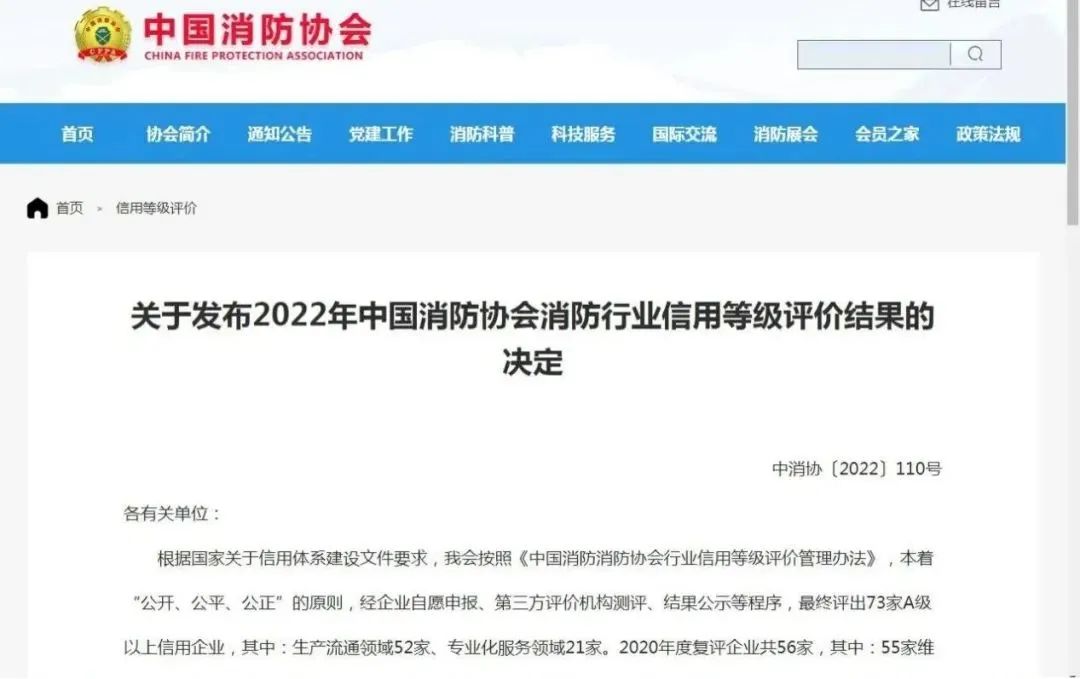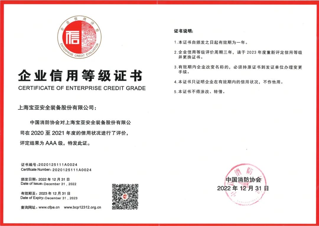 上海寶亞連續(xù)榮獲“中國(guó)消防協(xié)會(huì)企業(yè)信用等級(jí)評(píng)價(jià)AAA級(jí)”