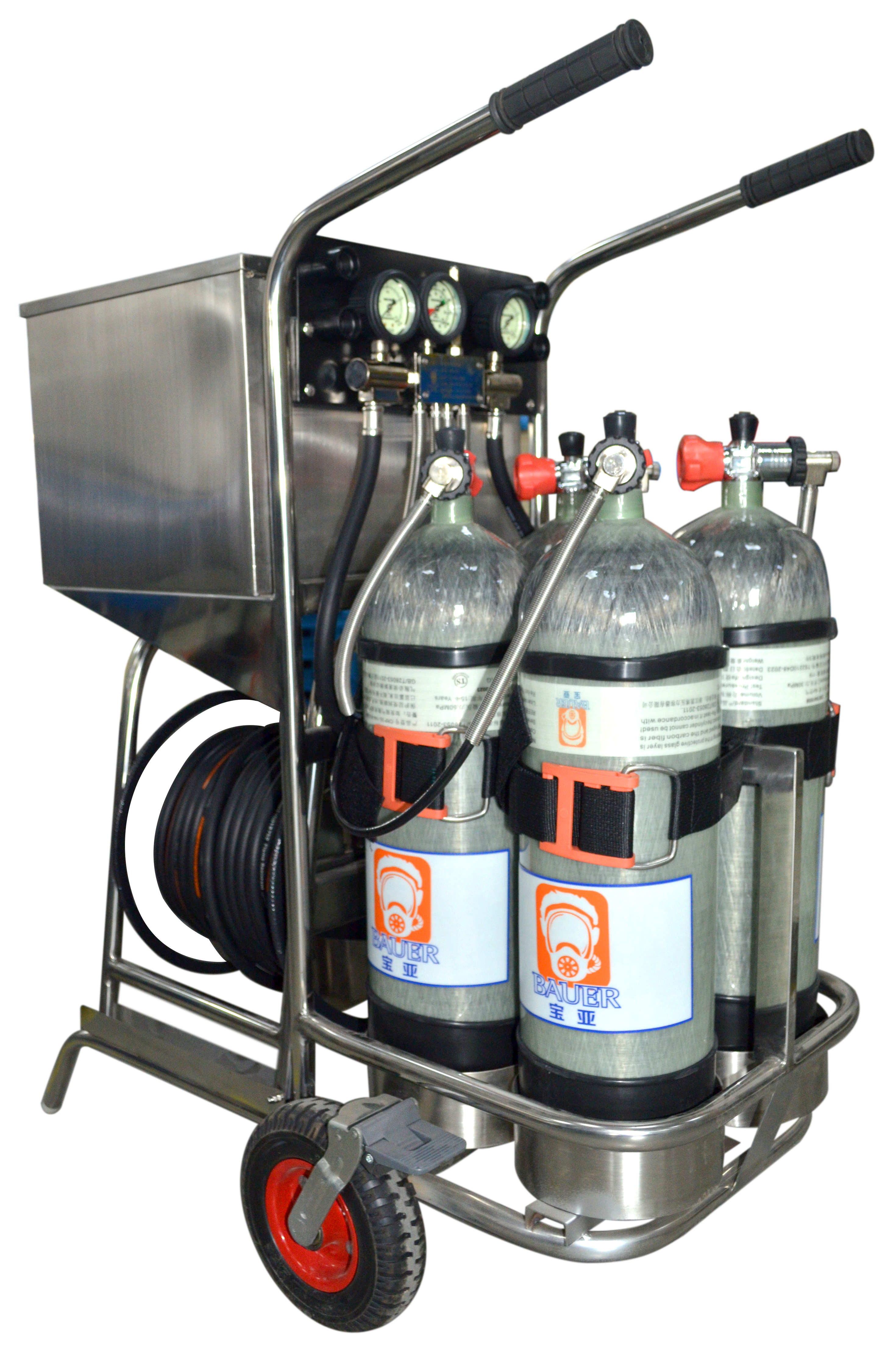 組成:不銹鋼車架、長管繞盤裝置、供氣管、氣瓶、氣源分配器、減壓器、壓力顯示裝置(中壓、高壓)、壓力報警裝置、全面罩、供氣閥、自動轉(zhuǎn)換逃生器裝備等組成。