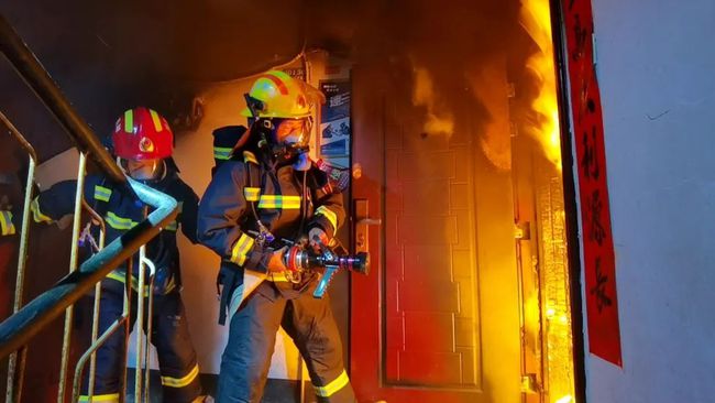 3、開(kāi)啟房門進(jìn)入室內(nèi)滅火前,確認(rèn)門開(kāi)啟的方式,觸摸、測(cè)量門體溫度。外開(kāi)門且位于下風(fēng)向時(shí),要采取限位措施防止門向外開(kāi)啟造成回燃或熱對(duì)流傷害;內(nèi)開(kāi)門位于上風(fēng)向時(shí),要拉住門把手或利用器材勾住房門,防止內(nèi)開(kāi)門向內(nèi)吹開(kāi)導(dǎo)致回燃傷害。