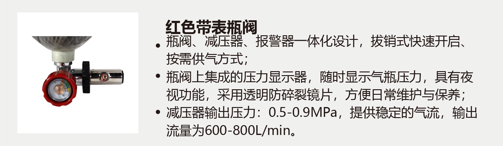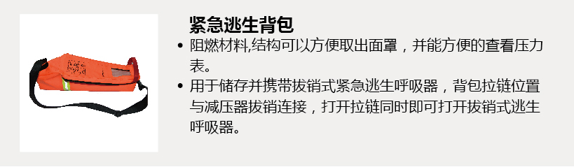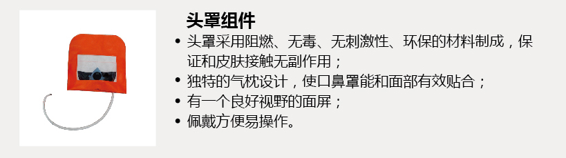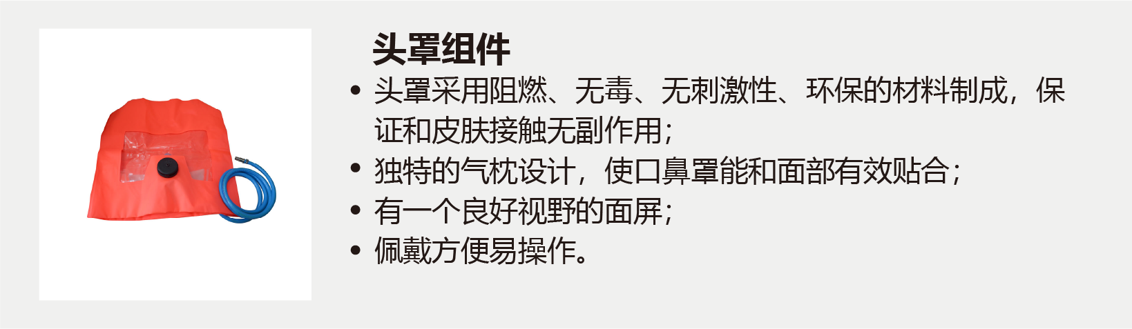 本產(chǎn)品是搶險救災(zāi)以及突發(fā)事故時逃離危險氣體及缺氧環(huán)境時使用,呼吸時使用氣瓶內(nèi)的空氣,不依賴外界環(huán)境氣體,以恒定的流量向頭罩內(nèi)供氣,供使用人員呼吸。