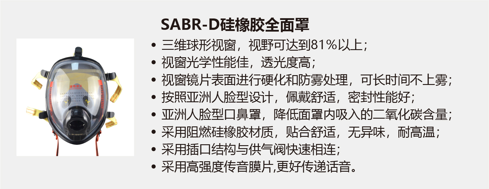 5. 球形視窗全面罩,視野好,膠體口鼻罩采用阻燃硅橡膠,佩戴舒適,對(duì)皮膚無(wú)刺激性;