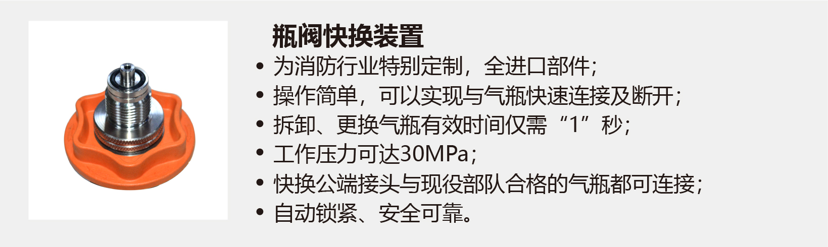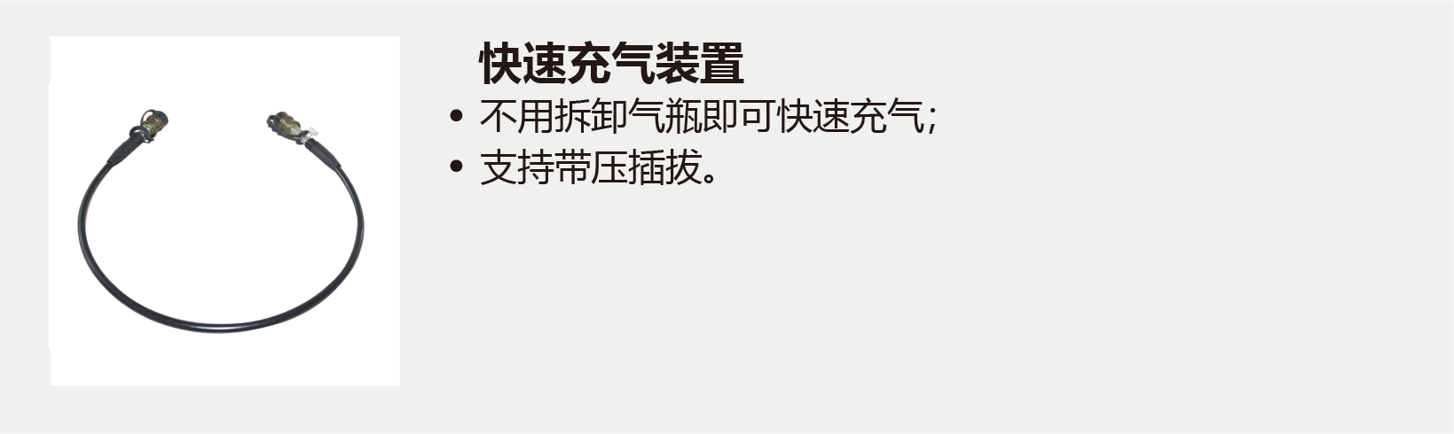 3. 整機重量輕,性能穩(wěn)定,可選擇快速充氣裝置、通訊裝置、氣瓶快換裝置配合使用;